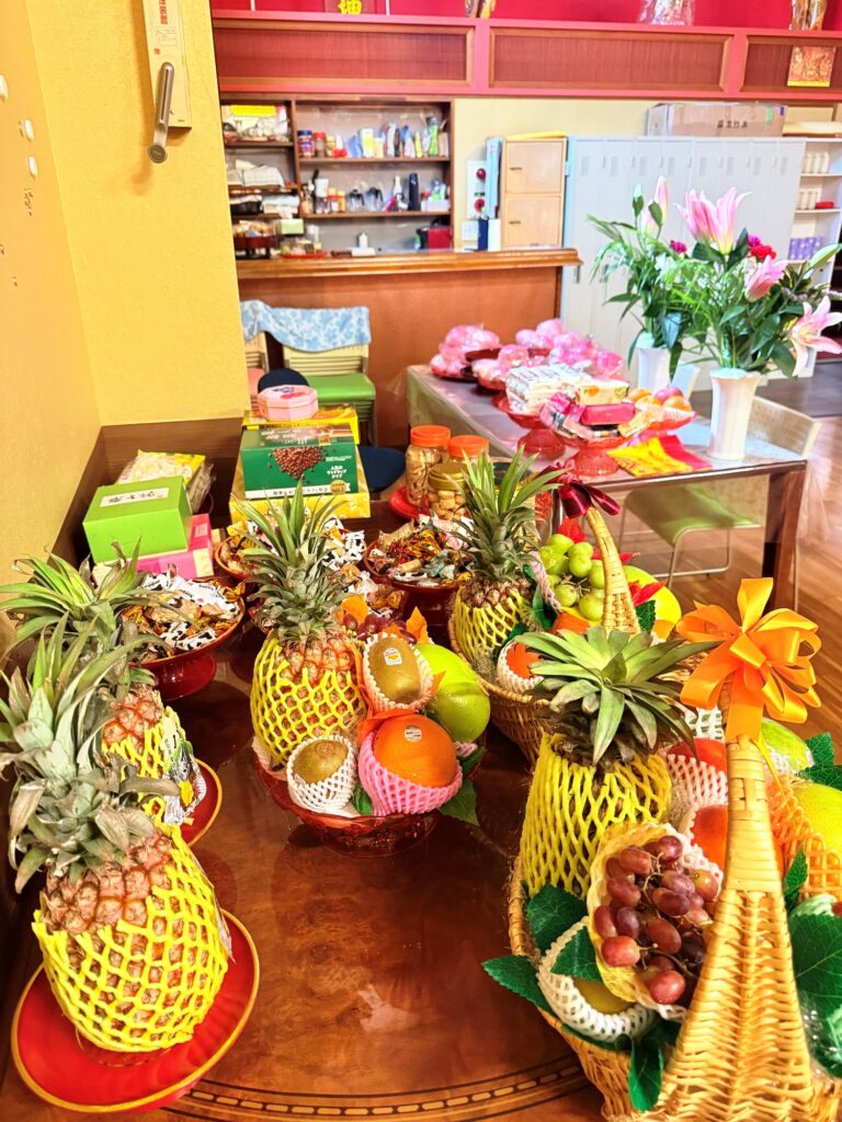 多くの果物、お花、お饅頭…のお供えをさせていただきます。(お供え前)
